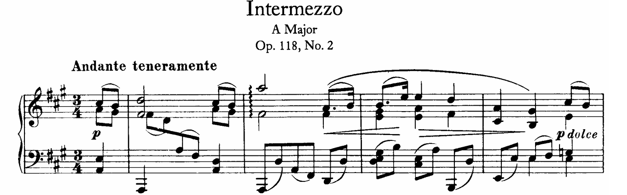 第4小節からは少し登っては元に引き戻される凸型(山型)の音型を延々と続ける。むなしく、力なく、満ち足りず、それでもまた登る。哀感と心の痛みが仄かに色調を変えていく様はこの曲の醍醐味であり人気の所以だろう。たくさんの表情を伝える標語が小節間の「その箇所」に挿入され気分の移ろいを象徴するが、ブラームスはテンポ変化ひとつとってもその指示に「エコノミー」な性格の人物で、大概の作品はそれをせずとも音楽で語るのが通例だ。Op.118-2はそれを必要としていること自体が異質な作品であることを物語っている。