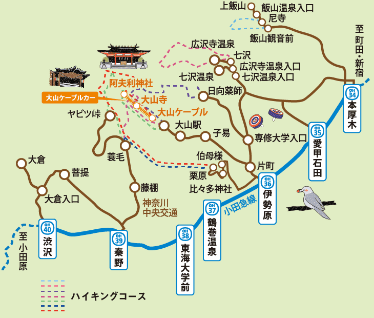 阿夫利神社は江戸時代に当社に参詣する「大山講」が関東各地に組織され、多くの庶民が参詣した。大山詣は6月27日から7月17日に行われる女人禁制の参詣で、特に鳶や職人の間で人気があった。(中略)。大山祇大神は、富士山に鎮まるとされる木花咲耶姫の父であるため、大山と富士山の「両詣り」も盛んとなり、「富士に登らば大山に登るべし、大山に登らば富士に登るべし」といわれた。なお、一部の地域には、大山に登ると一人前として認められるという伝承があり、大山の神霊が立身出世の神とされていたことがうかがえる。