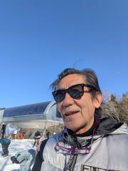 某日、今度はスキーを履く。スキーは昔ながらの長く(180cm)硬いスキーと今どきのカーヴィング・スキーの2本を使いこなす。今回も半日券を買った。感覚でいうと長い方は『しならせる』ように回転し、短いのはカラカラと滑らせる。