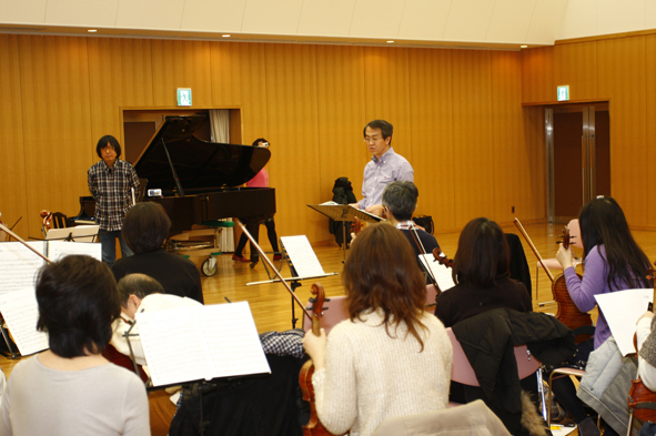 指揮の田崎瑞博先生が参加され、今回のプログラムのコンセプト「さよなら、モーツァルト君」の執筆者でもある東賢太郎さん(SMC)も見学に来て下さいました。